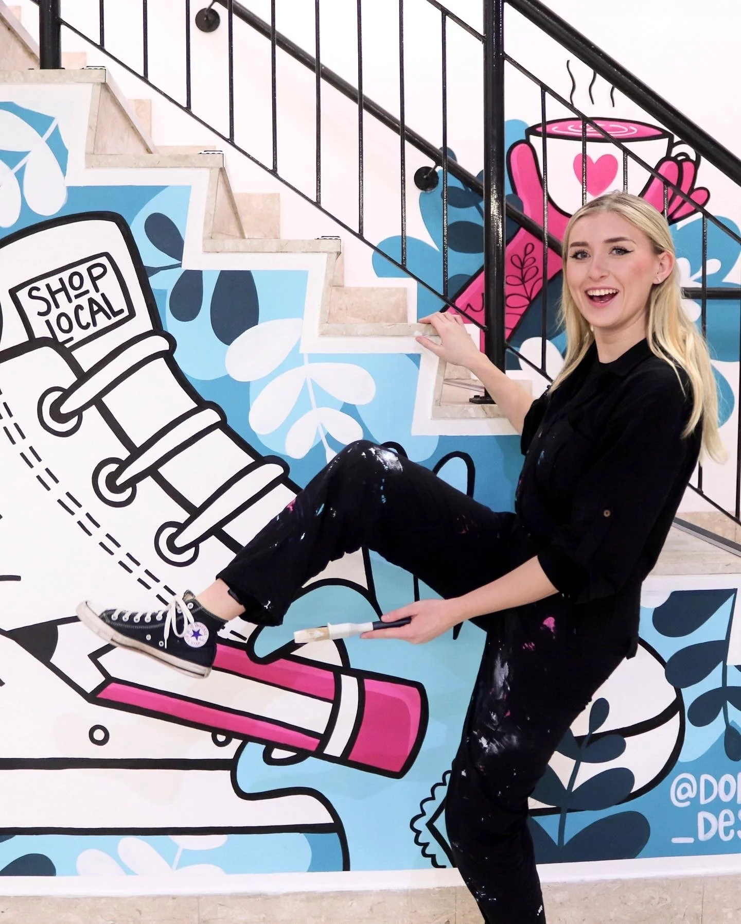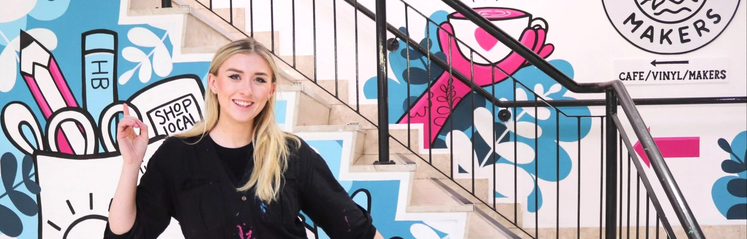 Commissioned to create an eye-catching mural inside The Avenue shopping centre in Bournemouth. The amazing South Coast Makers Store is upstairs, and they had an issue of how to direct customers upstairs and prevent them getting lost!
